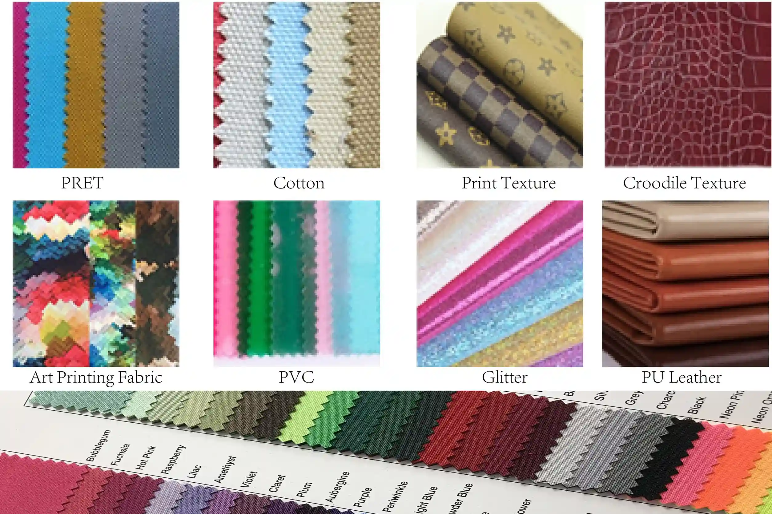 We maintain ready-to-ship color swatches for the most commonly used bag materials, including:PU/Oxford fabric/Nylon/Canvas/RPET (recycled fabric)